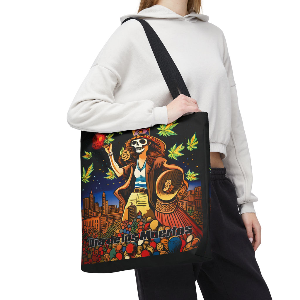 This TtCo Dia De Los Muertos 18" x 18" canvas tote is a masterpiece. This 18" x 18" black canvas tote bursts with vivid hues and intricate skull artwork inspired by traditional design. Printed edge-to-edge with rich, vibrant art that pops. Crafted from spun polyester with double-stitched seams, it’s tough enough for everyday use but stylish enough for gallery walls. Cotton webbing handles and a laminated lining complete the premium feel.