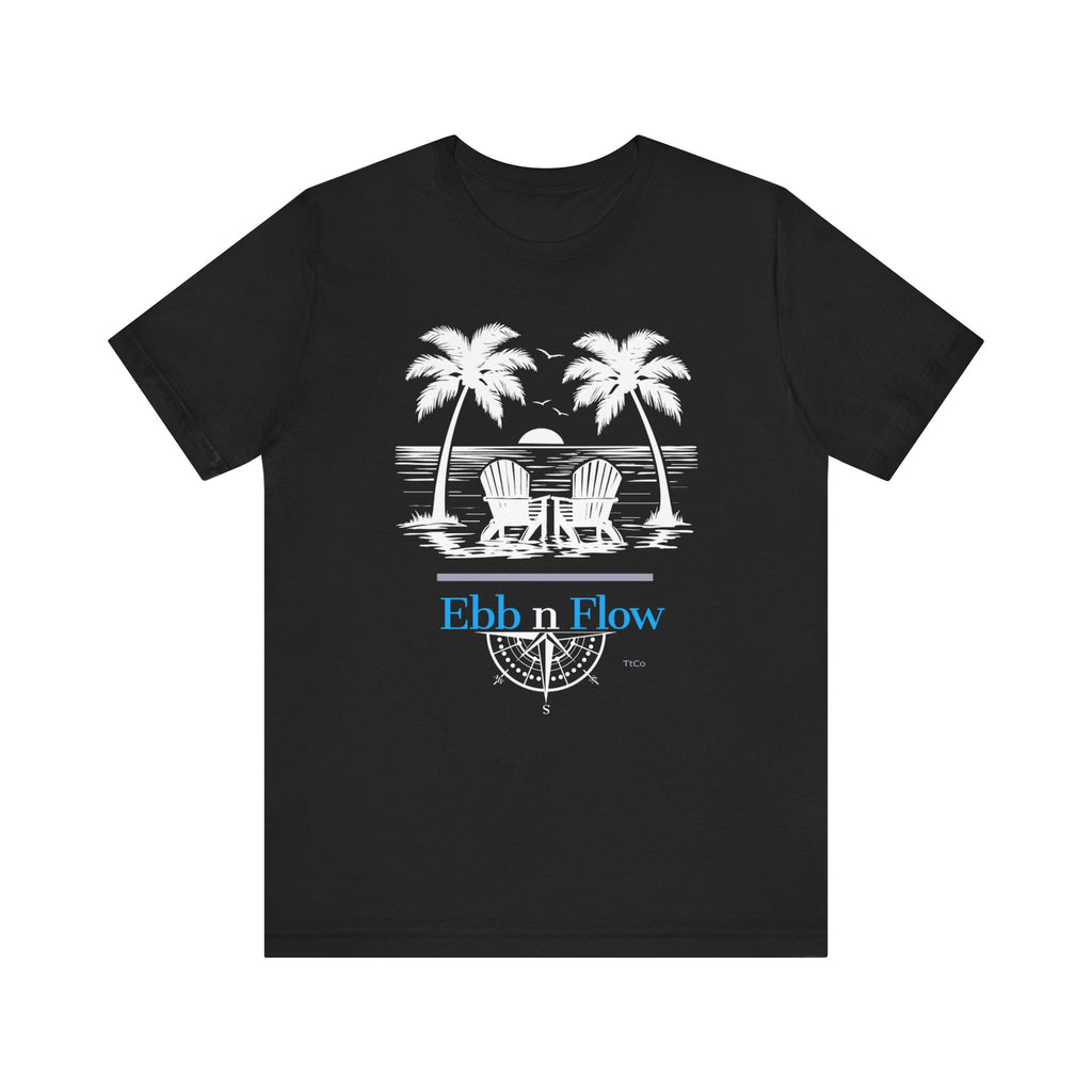 Soft, sun-warmed cotton that feels like barefoot mornings by the water. This lightweight jersey tee carries a calm, coastal scene—two Adirondack chairs between palms, a gentle moonrise and the words “Ebb n Flow” in a relaxed, nautical blue. Wear it folded over a boardwalk railing, layered under an open shirt at sunset, or packed for a spontaneous weekend ferry ride. The fit sits clean and modern; the ribbed crew neck and side seams keep the shape through countless washes. This is for those who live for low-key shoreline moments and quiet, restorative escapes.