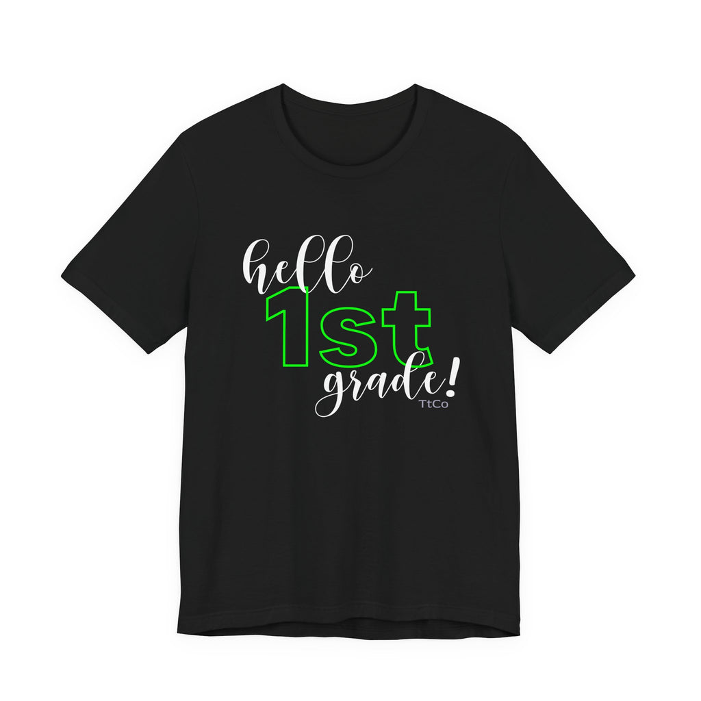 Make a statement with this bold white and green font Hello 1st Grade Short Sleeve Tee from TtCo. Show your school spirit and be comfortable while you teach. Perfect for educators looking to add a pop of color to their wardrobe and showcase their school pride. Ideal for back-to-school season, teacher appreciation week, and casual Fridays at school.